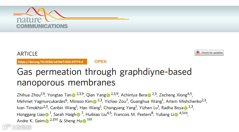 基于此,厦门大学胡晟教授、中国科学院化学研究所李玉良院士和英国曼彻斯特大学Andre K. Geim教授合作,在国际知名期刊Nature Communications上发表题为“Gas permeation through graphdiyne-based nanoporous membranes”的研究论文。
