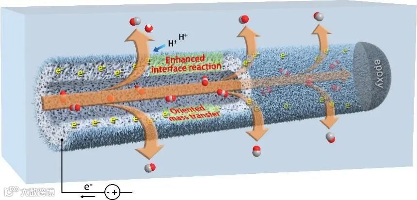 图1. 微/纳结构中空纤维银电极高效电还原CO2示意图。