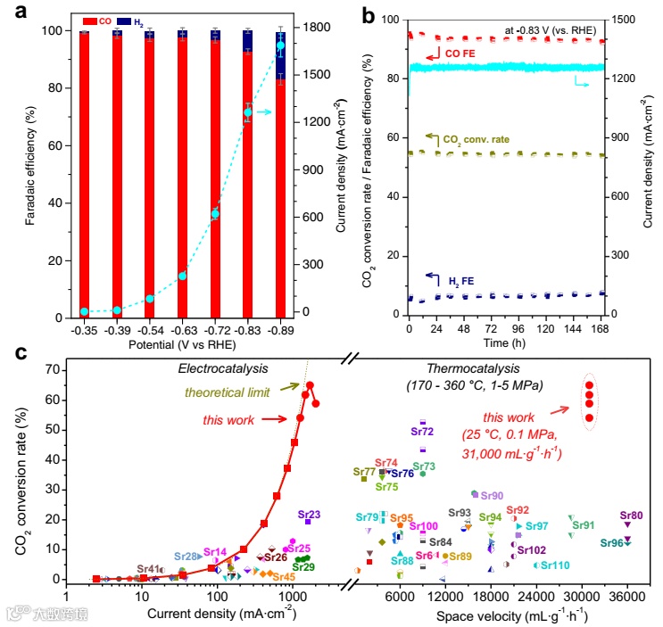 要点2:微/纳结构中空纤维银电极在常温常压高空速(≥30000 mL∙gcat-1∙h-1)条件下于-0.83 V (vs. RHE)CO2单程转化率≥54%,超过7天的稳定性测试中始终保持高电流密度(> 1.2 A∙cm-2)与CO法拉第效率(> 92%),显示出优异电还原CO2生成CO的能力。