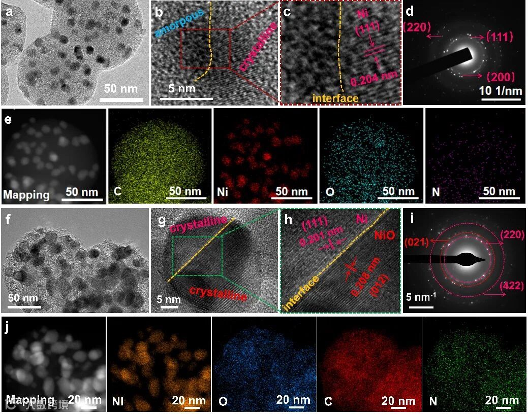 该工作通过简单的水热和热解耦合策略,在氮掺杂的碳球上成功制备了晶相/非晶相CA-Ni/NiO@NCS和晶相/晶相CC-Ni/NiO@NCS界面异质结构模型催化剂。值得注意的是,在所构筑的模型体系中,仅有NiO组分发生了晶型转变。