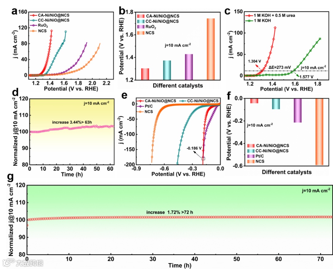 可以看出,在含0.5 M尿素的1.0 M KOH溶液中,该CA-Ni/NiO@NCS催化剂仅需要1.304 V的电位来驱动10 mA/cm2电流密度下的UOR,这比常规电解水体系下的催化电位低273 mV。对于HER,该催化剂仅需-0.096 V的电位即可达到10 mA/cm2的电流密度。更重要的是,在电流密度为10 mA/cm2的条件下,该催化剂能够保持较好的UOR及HER催化稳定性。