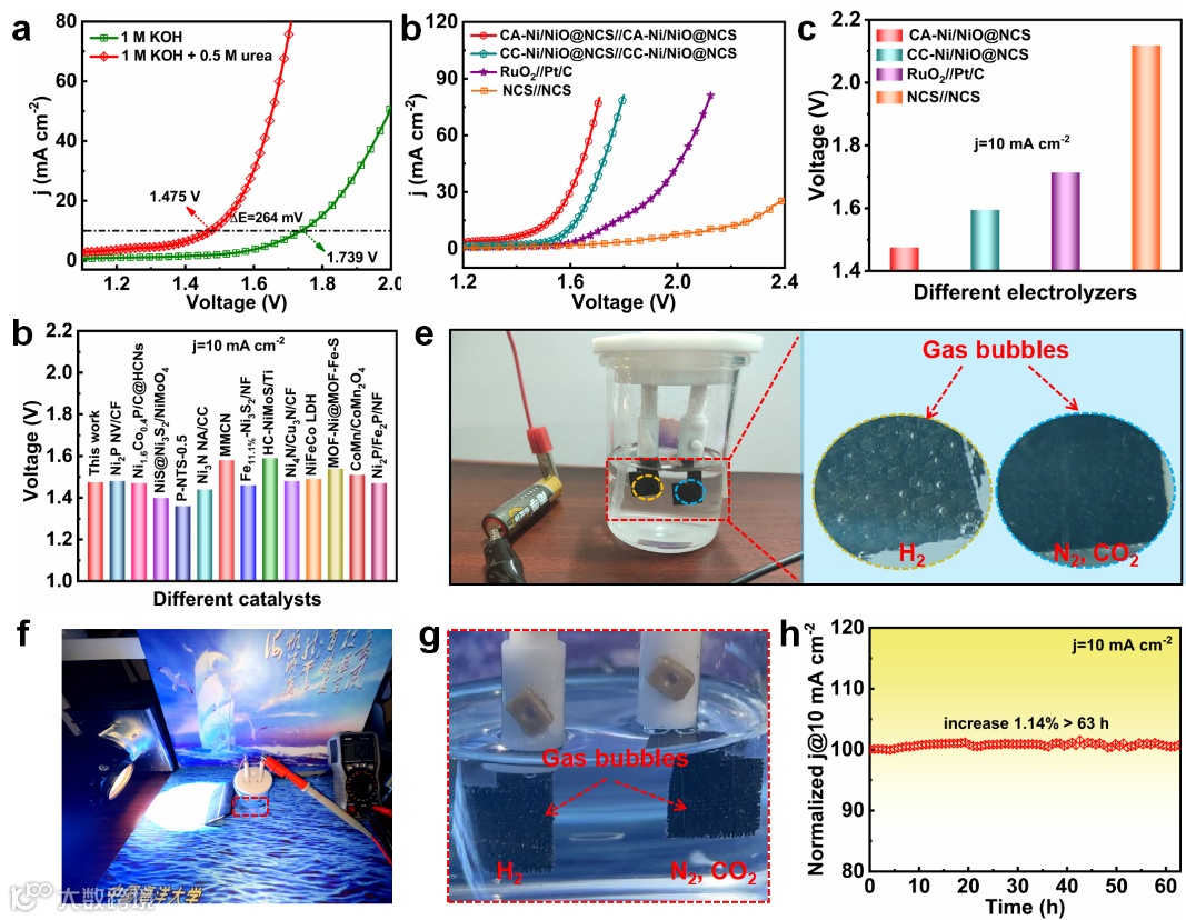 以晶相/非晶相CA-Ni/NiO@NCS作为阳极和阴极构建了尿素电解双电极体系,达到10 mA cm-2的电流密度时仅需施加1.475 V的电压,远低于常规电解水体系所需电压(1.739 V)。此外,采用AA电池或开路电压为1.5 V的商用太阳能电池驱动该电解槽时,其表现出优越的尿素电解制氢性能。该工作解释了晶相/非晶相和晶相/晶相界面异质结构在催化UOR和HER方面的作用,为界面工程应用于双功能电催化剂开发方面提供了新的见解。
