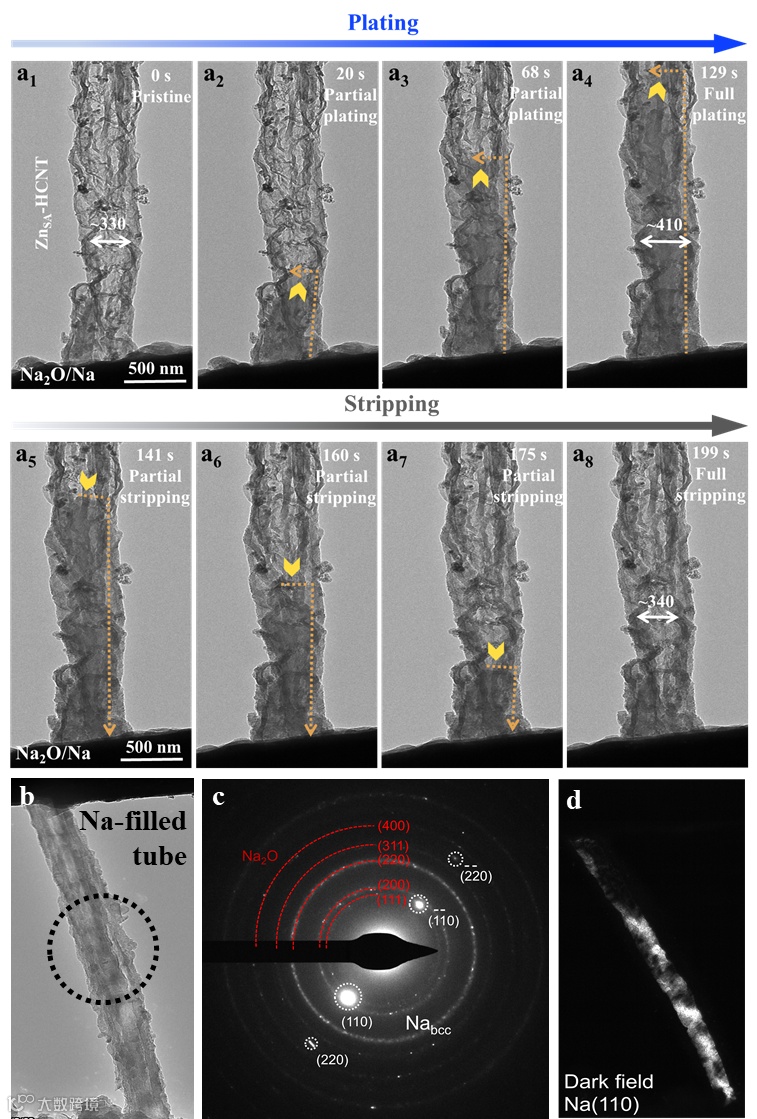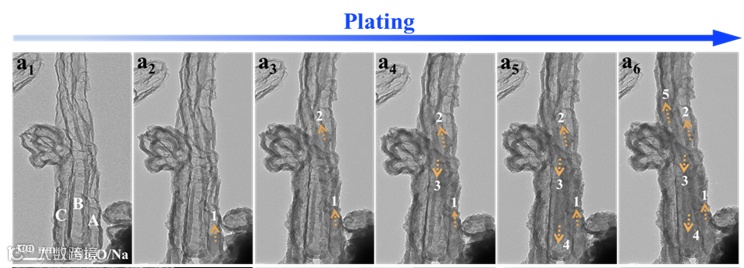 图2 In situ TEM原位观察钠在单根管中的沉积剥离过程
