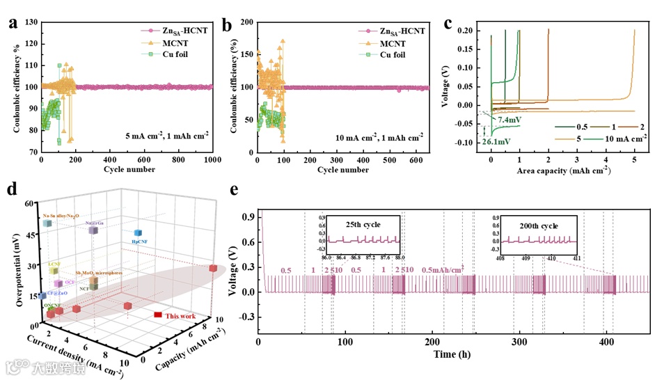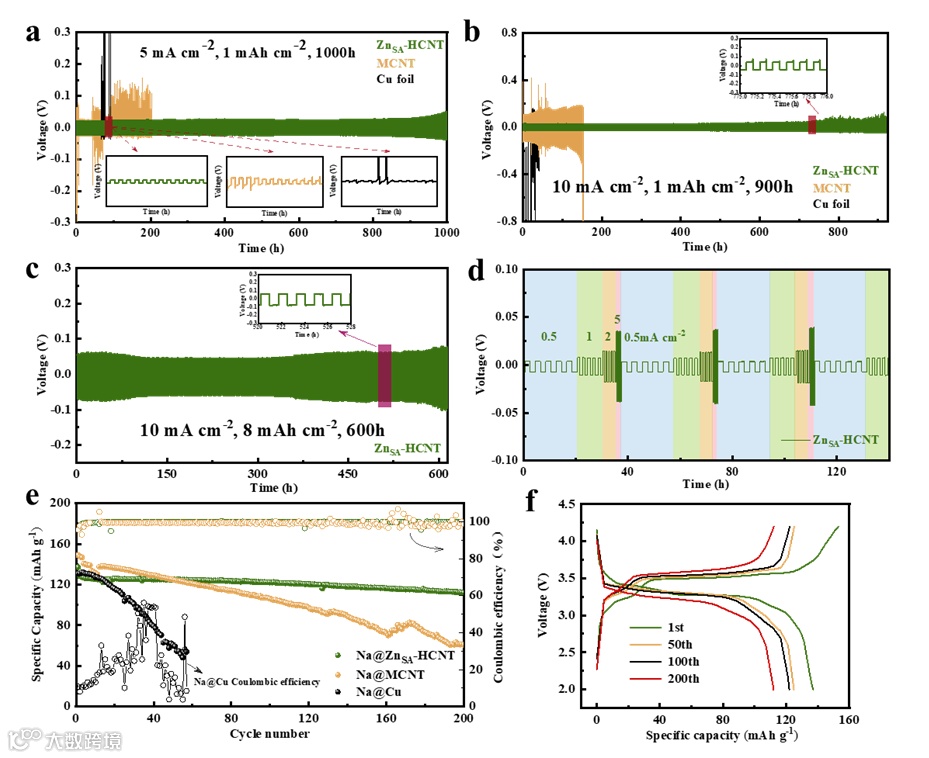 得益于ZnSA-HCNT优良的储钠能力,ZnSA-HCNT电极实现了优良的电化学性能(图4和图5)。具体来说,由ZnSA-HCNT电极组成的对称电池可以在极高的电流密度和面容量(10 mA cm-2和8 mA cm-2)下循环超过600小时。在10 mA cm-2的高电流密度下,半电池的库仑效率可以保持在99.87%以上,稳定循环超过600圈。此外,在10 mA cm-2的超高电流密度下成核过电位仅为20 mV左右。ZnSA-HCNT@PB全电池提供了优良的循环性能,这项工作将有效促进金属钠电池的商业应用。
