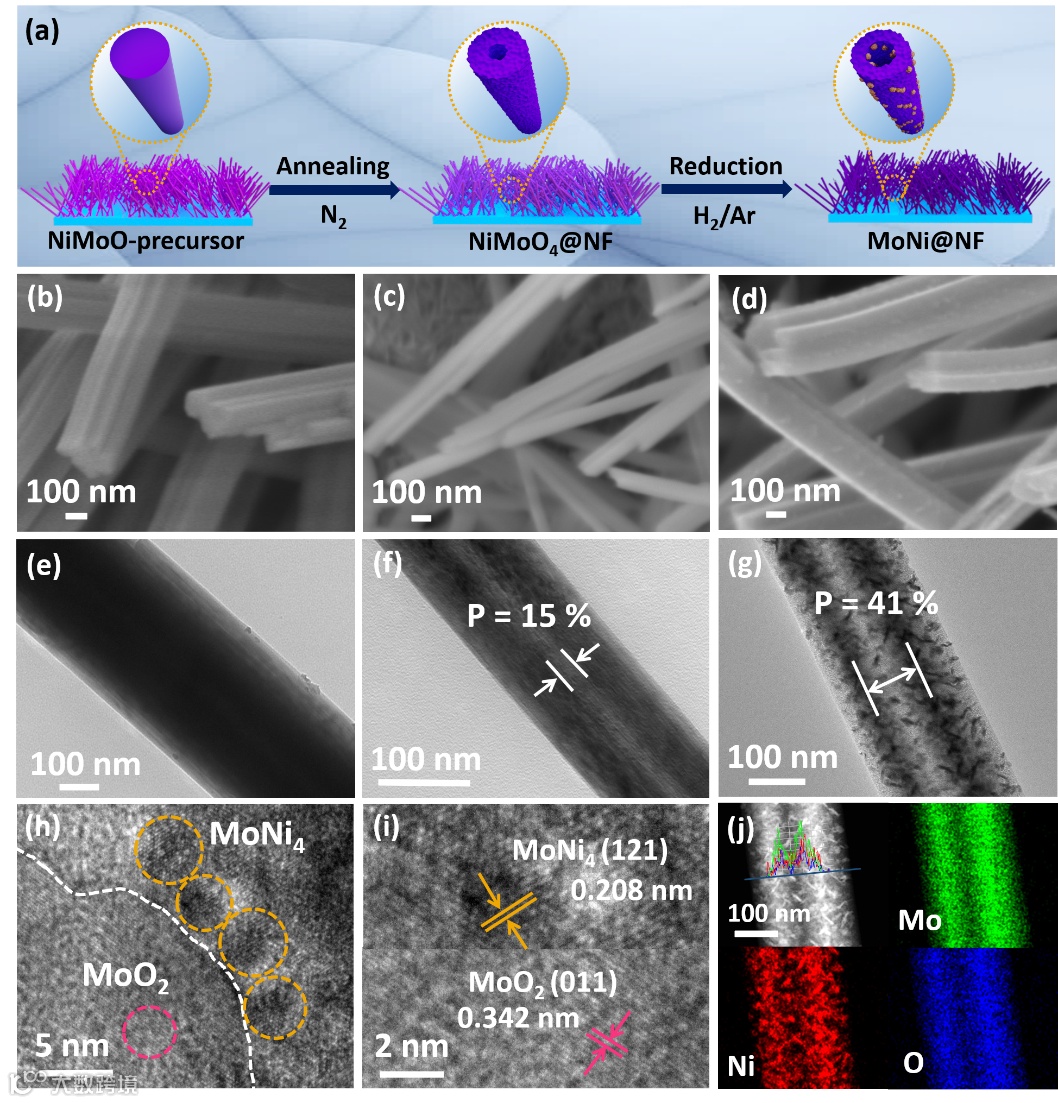 Figure 1 (a) Schematic illustration of the formation process of MoNi@NF. SEM images of (b) NiMoO-precursor, (c) NiMoO4@NF, and (d) MoNi@NF. TEM images of (e) NiMoO-precursor, (f) NiMoO4@NF, and (g) MoNi@NF. (h, i) HRTEM images of MoNi@NF. (j) TEM image and corresponding elemental mappings of MoNi@NF.