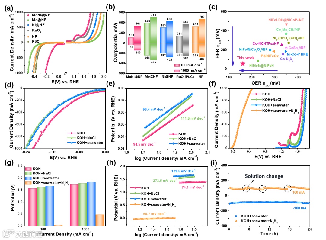 Figure 3 HER and OER performance of the as-prepared catalysts for (a) Polarization curves, (b) overpotential at 100 and 1000 mA cm-2, and (c) comparison of the overpotentials for OER (at 100 mA cm-2) and HER (at -100 mA cm-2) of the prepared MoNi@NF and other reported bifunctional electrocatalysts in 1.0 M KOH. (d) Polarization curves and (e) corresponding Tafel plots for HER in different solutions. (f) Polarization curves, (g) corresponding Tafel plots, and (h) potential at 100 and 1000 mA cm-2 in different solutions. (i) Chronoamperometry i-t curve for 24 h for HER and HzOR