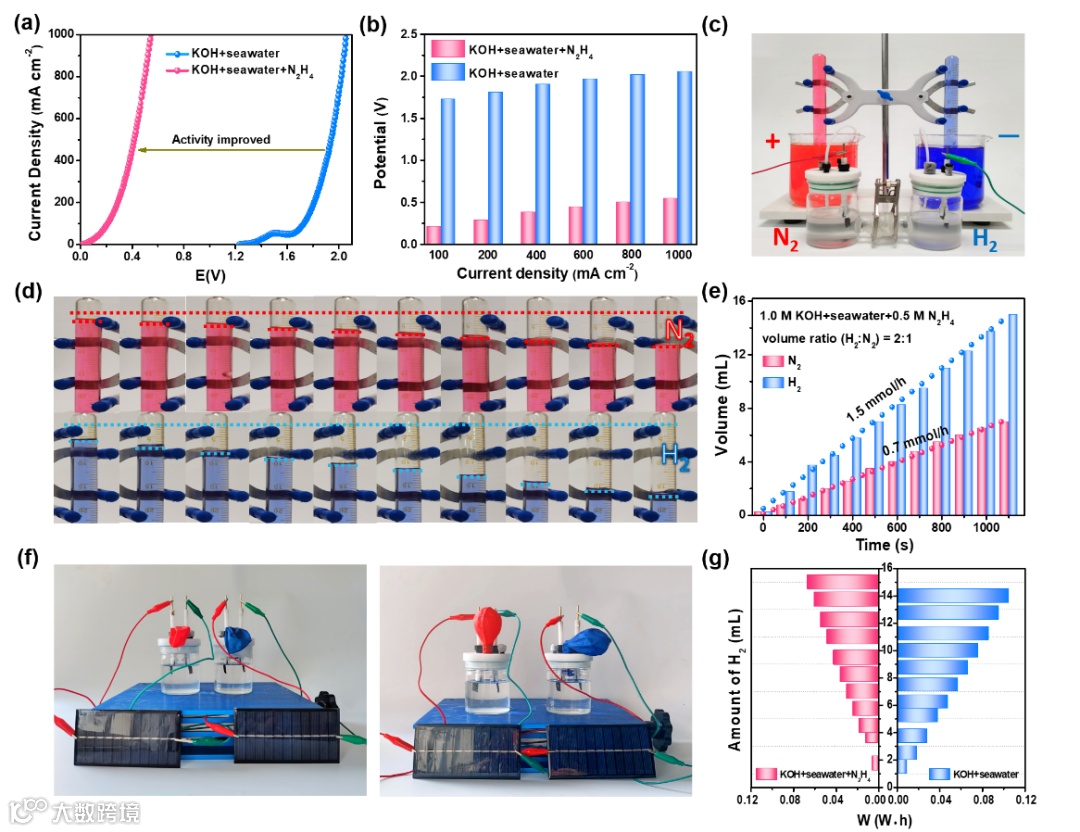 Figure 5 (a) LSV curves of the MoNi@NF couple in different solutions. (b) Comparison of the potentials to achieve different current densities for MoNi@NF. (c) The gas collection device of alkaline seawater splitting. (d) Photographs of H2 and N2 collected at different times in 1.0 M KOH+seawater+0.5 M N2H4; (e) The amount of H2 and N2 varying with time in 1.0 M KOH+seawater+0.5 M N2H4; (f) Image of the electrocatalytic process powered by the solar panels; (g) The power consumption varying with amount of H2.