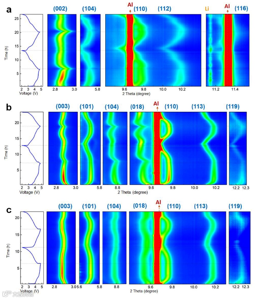图3. O2/O3-、O2-和O3-LLOs的原位结构表征。a) O2-LLO, b) O3-LLO, c) O2/O3-LLO的原位同步高能XRD谱图和相应的充放电曲线。