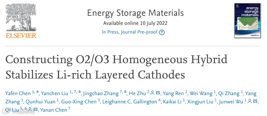 Chen,Y., Liu, Y., Zhang, J., Zhu, H., Ren, Y., Wang, W., Zhang, Q., Zhang,Y., Yuan, Q., Chen, G., Gallington, L. C., Li, K., Liu, X., Wu, j.,Liu, Q. & Chen, Y. Constructing O2/O3 Homogeneous HybridStabilizes Li-rich Layered Cathodes, Energy Storage Materials (2022). DOI: 10.1016/j.ensm.2022.07.016
