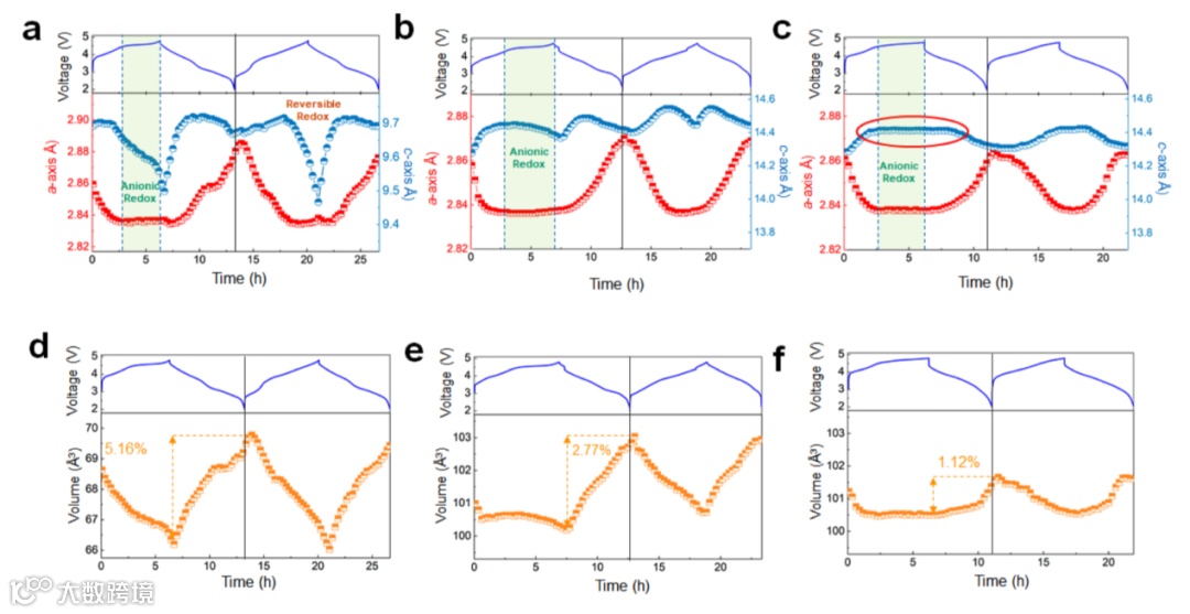 图4. 三种材料前两个循环的晶胞参数和晶胞体积变化 (a-b) O2-LLO;(c-d) O3-LLO;(e-f) O2/O3-LLO