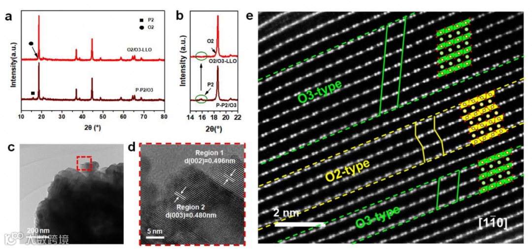 图1. a)-b) P-P2/O3和O2/O3- LLO的粉末XRD谱图。c)-d) O2/O3-LLO的HRTEM图像。e) O2/O3-LLO沿[1-10]带轴的HAADF-STEM图像(绿色和黄色虚线区域分别框起O3型ABCABC和O2型ABCBA的氧叠加序列)。
