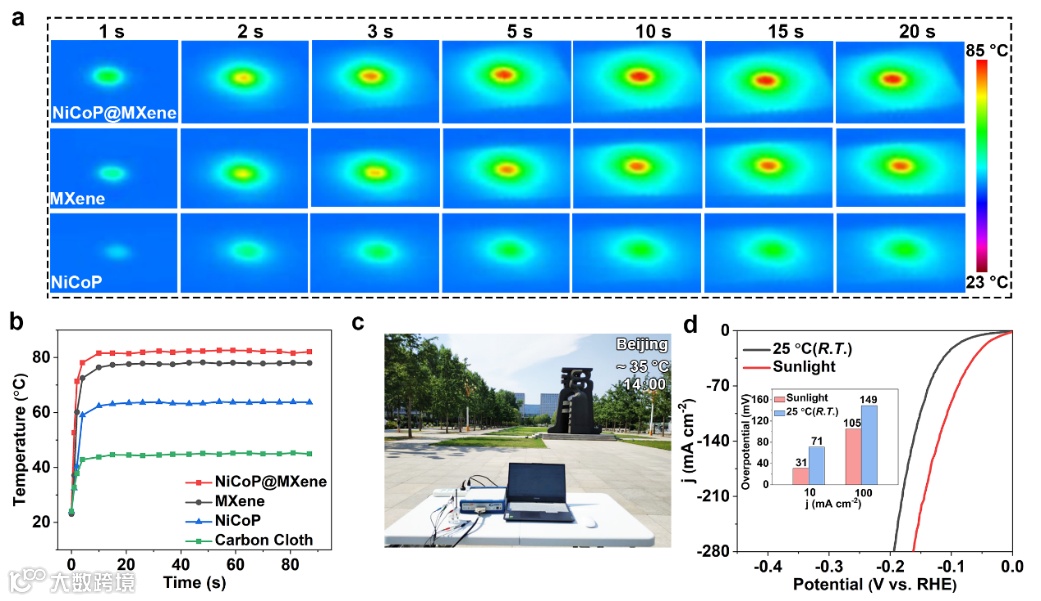 图7. 升温特性及室外利用太阳光的性能提升:(a-b)三种材料的光热升温图,(c-d)NiCoP@MXene室外阳光辐射提升HER性能