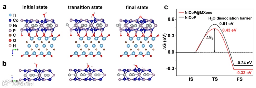 最后,基于构建优化的原子模型,利用DFT计算得出NiCoP@MXene与NiCoP的水解离能垒分别为0.43和0.51 eV,表明NiCoP和MXene之间的界面可以有效地降低16.0%的水离解能垒(图6)。