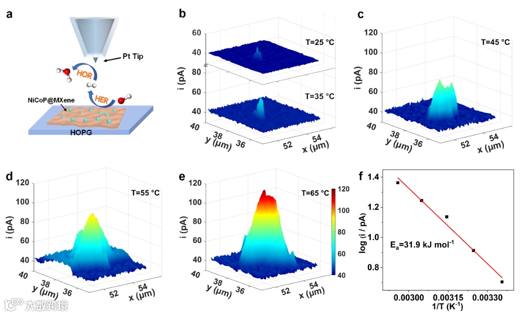 图5. 单片层NiCoP@MXene的SECM测试图及或活化能图:(a)SECM测试机理示意图,(b-e)不同温度下单片层的三维电流图,(f)利用SECM测试得到的活化能。