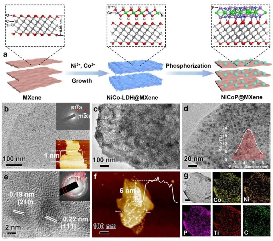 图2. 材料的合成与表征:(a)合成示意图,(b-d)中间产物与最终产物的表征图,(e-g)NiCoP@MXene的表征图。