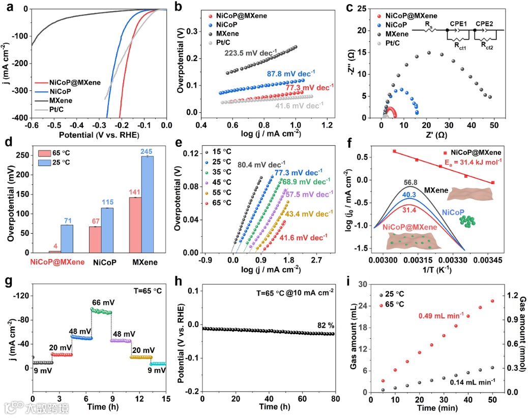 图4. 材料的电化学性能测试:(a-c)室温下碱性HER性能,(d-e)NiCoP@MXene在不同温度下的性能对比,(f)三种材料活化能数值对比,(g-i)稳定性和产气速率