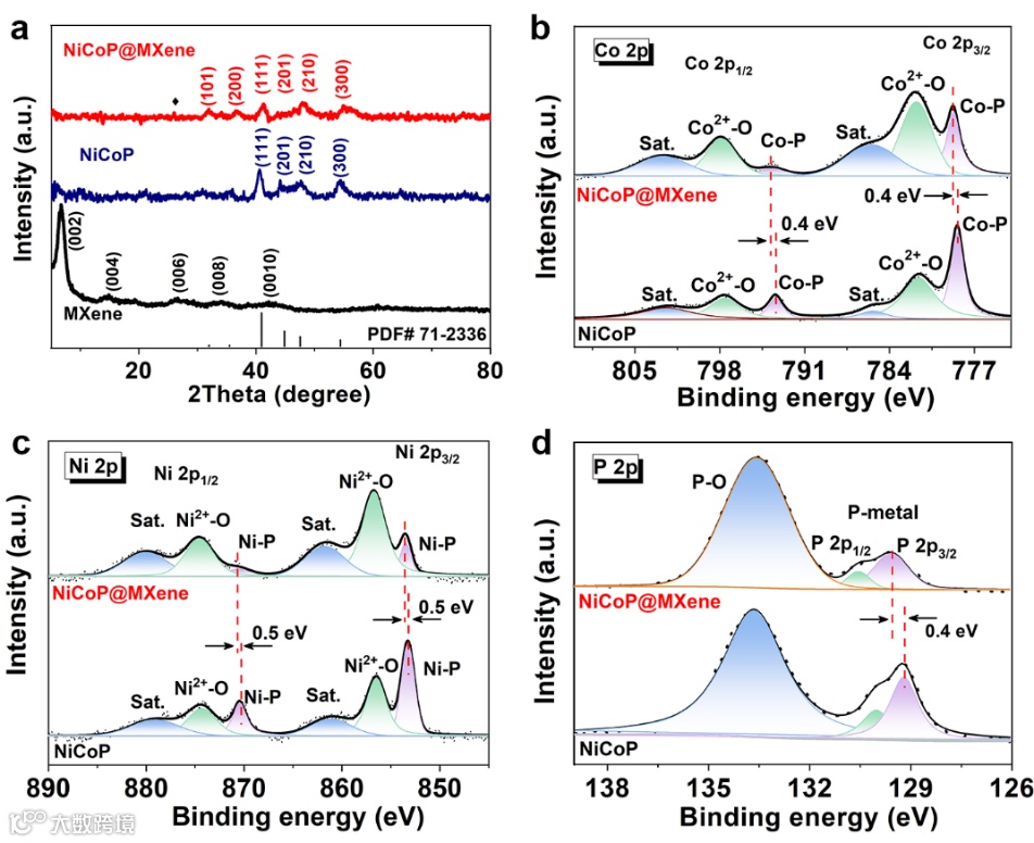 (1)MXene利用其表面丰富的含氧官能团,高度分散与稳定了NiCoP颗粒,提升了NiCoP催化剂暴露的活性比表面积;