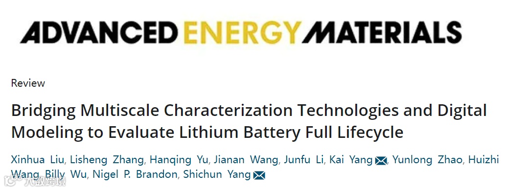 基于此,来自北京航空航天大学的刘新华,杨世春教授与英国萨里大学的杨凯博士合作,在国际知名期刊Advanced Energy Materials上发表题为“Bridging Multiscale Characterization Technologies and Digital Modeling to Evaluate Lithium Battery Full Lifecycle”的文章。