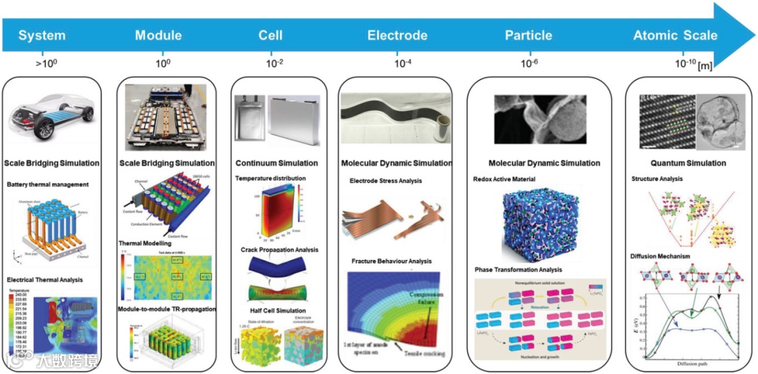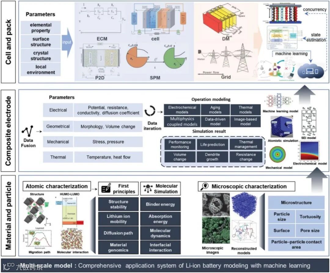 图4展示了从材料和粒子层、复合电极层到单体和电池包层的多尺度建模。本要点主要讨论了锂电池研究中面向参数的多尺度模型及其相关方法。