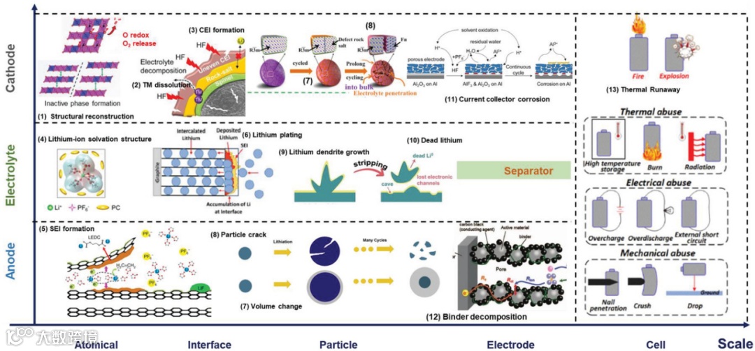 在此,本要点从不同长度尺度的层面讨论了三种主要的老化模式:活性锂离子的损失、电极老化和电解质的损失。锂电池的老化总是涉及电化学/机械/热多尺度耦合过程,在各种滥用操作条件下进一步恶化。目前为止研究人员致力于研究特定的老化反应,但在实际和动态操作条件下仍有失效机制未被发现。