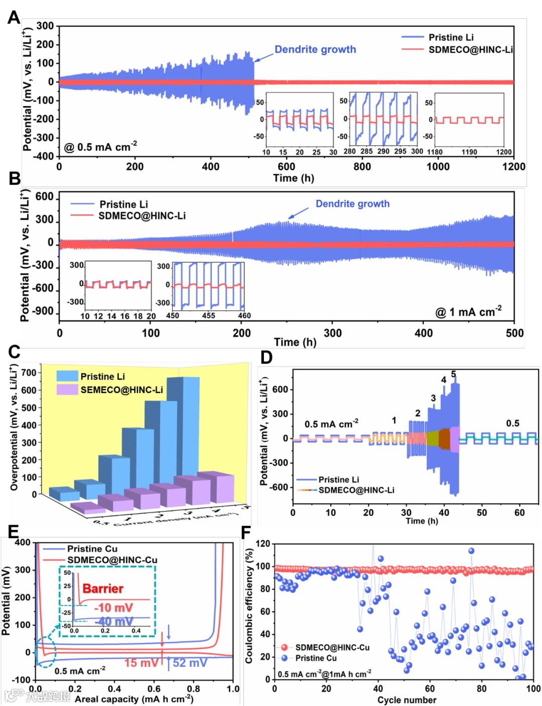 由于Ce的4f中心电子结构重排,产生大量活性位点提升了SDMECO@HINC的催化活性,降低了锂原子的形核势垒(图3)。在后续循环过程中,其过电位稳定在~13 mV并持续稳定1200 h没有枝晶形成。即使提升电流密度和面容量至2 mA cm-2 和2 mA h cm-2,SDMECO@HINC-Li电极在700 h内仍保持不超过100 mV的低过电位。同时,SDMECO@HINC催化层还能显著提升Li电极的充放电库伦效率至98%左右,说明SDMECO@HINC使Li原子的扩散更快并且沉积更均匀。