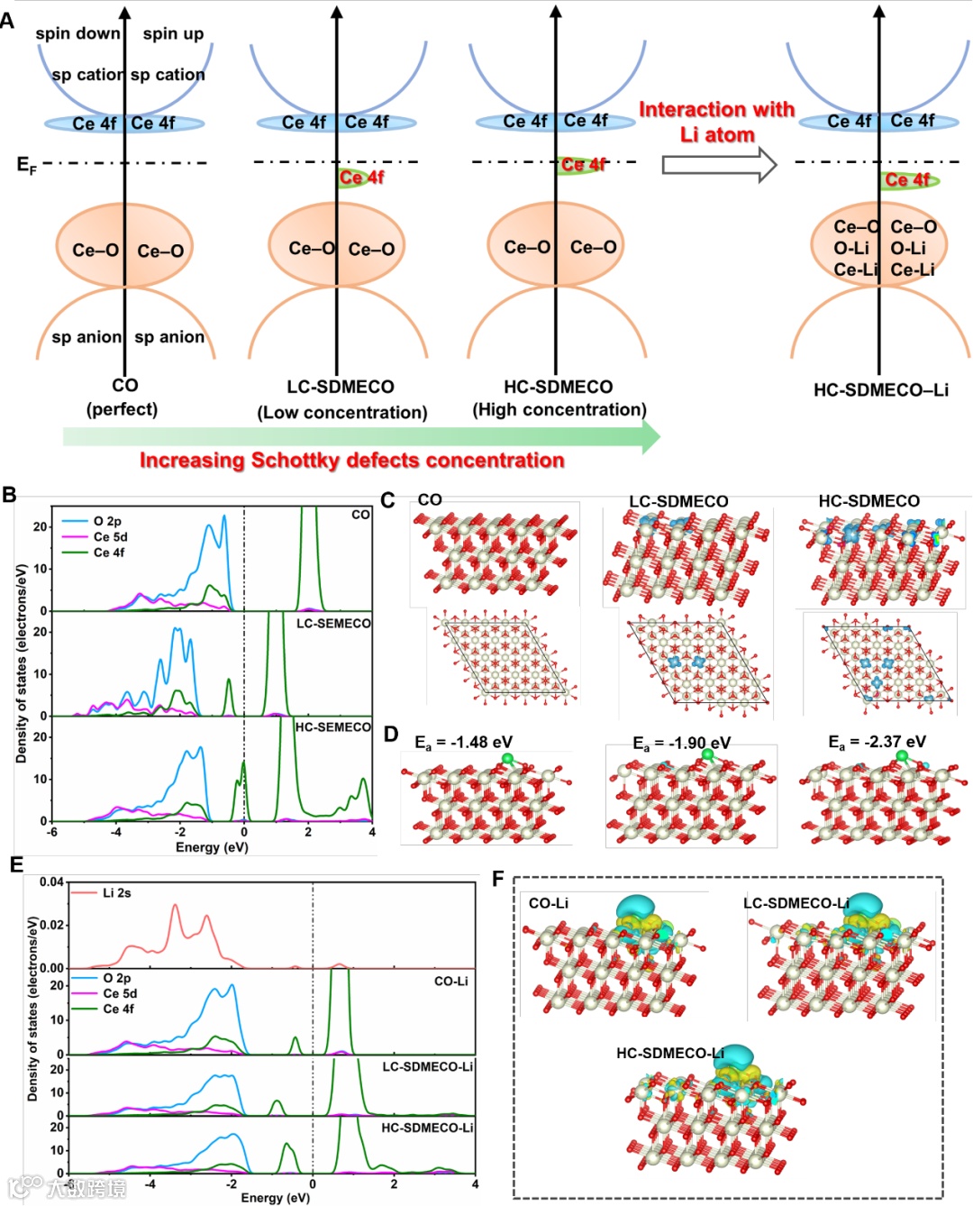 图1 理论模拟肖脱基缺陷调控氧化铈电子结构及其与锂原子的作用关系