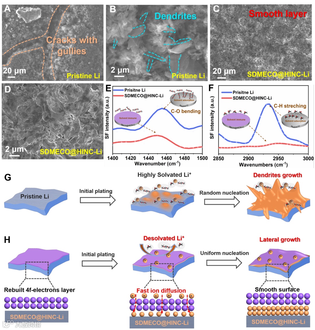 通过SEM观察到循环后裸锂电极表面出现了明显的Li枝晶(图4),而SDMECO@HINC改性后金属锂表面均匀光滑且没出现明显的体积变化。利用界面敏感的原位和频率光谱(SFG)进一步验证了SDMECO@HINC修饰层的催化去溶剂化作用,有效地促进了从溶剂化的Li+中生成自由的Li+,实现均匀锂沉积。