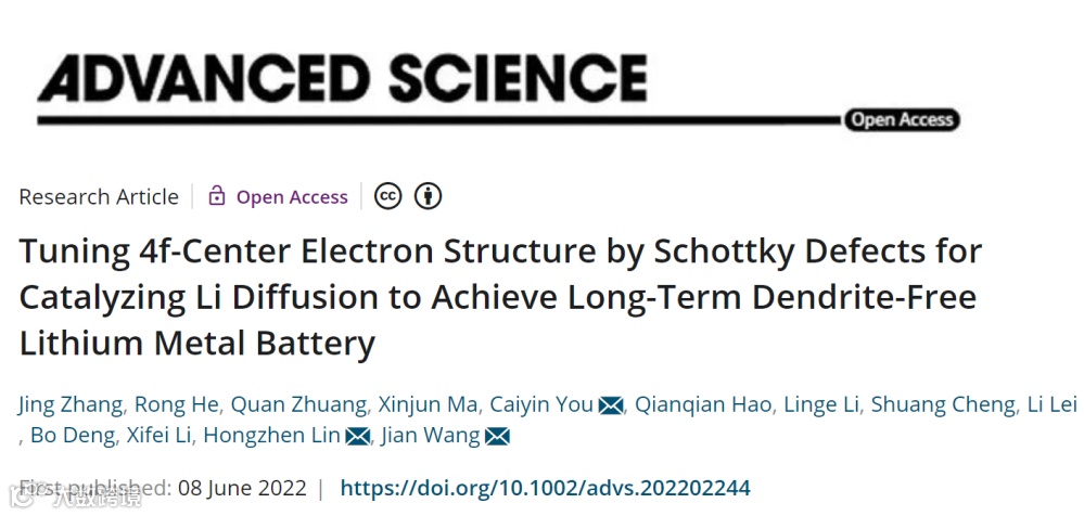 Tuning 4f-center Electron Structure by Schottky Defects for Catalyzing Li Diffusion to Achieve Long-term Dendrite-free Lithium Metal Battery Jing Zhang, Rong He, Quan Zhuang, Xinjun Ma, Caiyin You, Qianqian Hao, Linge Li, Shuang Cheng, Li Lei, Bo Deng, Xifei Li, Hongzhen Lin, and Jian Wang, Adv. Sci. 2022, 20210468. DOI: 10.1002/advs.202202244