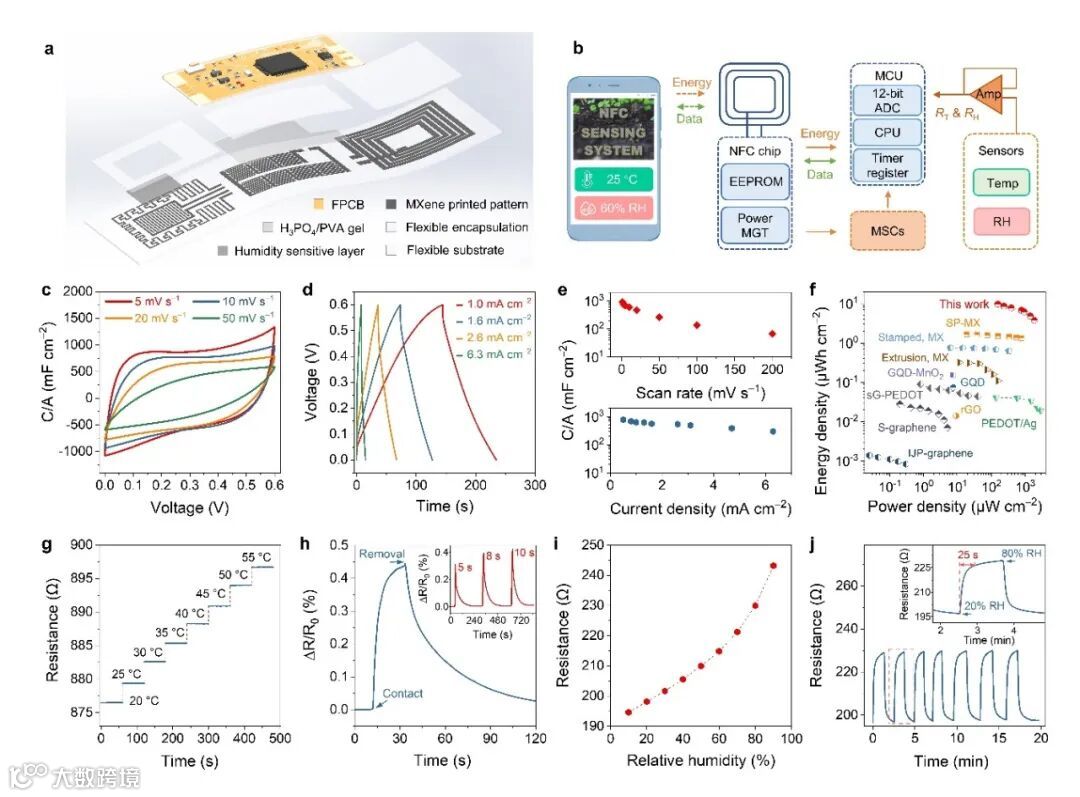 图5 基于MXene墨汁打印的具有温湿度传感、能量存储和无线通讯功能的集成感知系统。