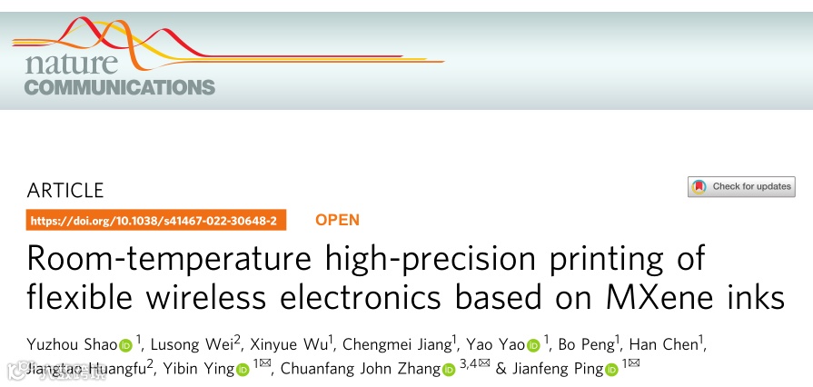 基于此,浙江大学平建峰教授、应义斌教授和瑞士联邦理工学院联邦材料研究所张传芳研究员通力合作,报道了一种基于MXene水性墨汁的室温直接打印技术,可在多种柔性基底上实现无线可穿戴电子器件的直接适形打印,且无需印后退火等繁琐处理工序。该研究工作发表在Nature Communications上,其中邵雨舟博士为论文的第一作者,平建峰教授、应义斌教授和张传芳研究员为共同通讯作者。