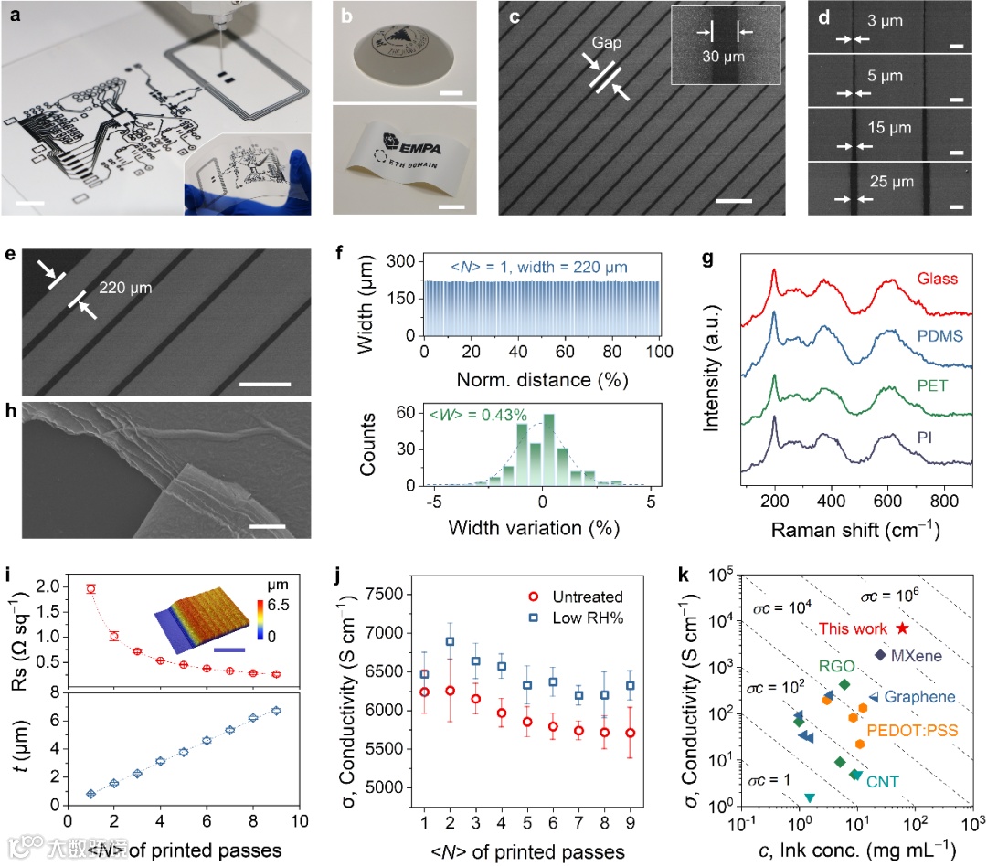 图2 MXene墨汁室温直接打印的精度和导电性表征。
