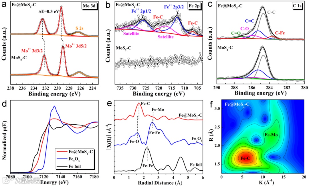 图3. 光谱表征。(a)Mo 3d的X射线光电子能谱曲线对比。(b)Fe 2p的X射线光电子能谱曲线对比。(c)C 1s的X射线光电子能谱曲线对比。(d)Fe@MoS2–C亚微米反应器的同步辐射Fe K边近边吸收谱图,(e)同步辐射Fe K边扩展边吸收谱图,(f)小波变化