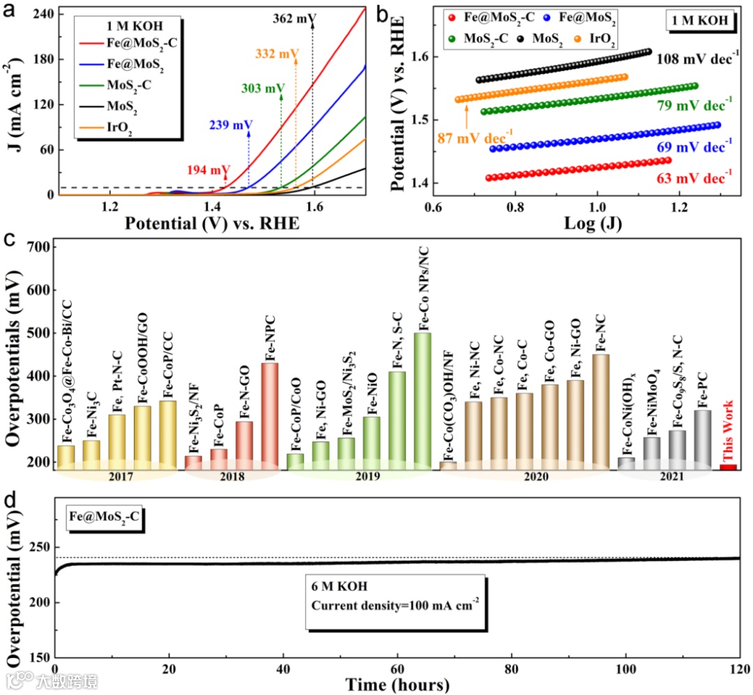 通过极化曲线对比发现:1)不同宿主材料同时负载Fe单原子时(S–Fe@MoS2–C,Y-Fe@MoS2–C和中空Fe@MoS2–C),中空亚微米反应器具有最低的OER过电位;2)同样的宿主条件下(中空MoS2–C),插层碳和Fe单原子共存情况下(Fe@MoS2–C),催化剂表现出最优的活性(图4a-b)。