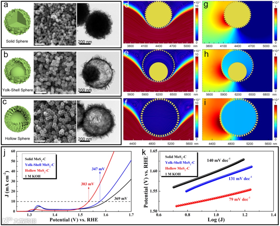 图1. MoS2–C宿主材料的结构分析,有限元模拟与分析和OER活性。(a)实心纳米结构的模型、场发射扫描电镜和透射电镜图。(b)蛋黄蛋壳纳米结构的模型、场发射扫描电镜和透射电镜图。(c)中空纳米结构的模型、场发射扫描电镜和透射电镜图。粒径分布图。(d-f)三种结构模型的流速场分布。(g-i)三种结构模型的压力场分布。三种结构催化剂的(j)极化曲线和(k)塔菲尔斜率