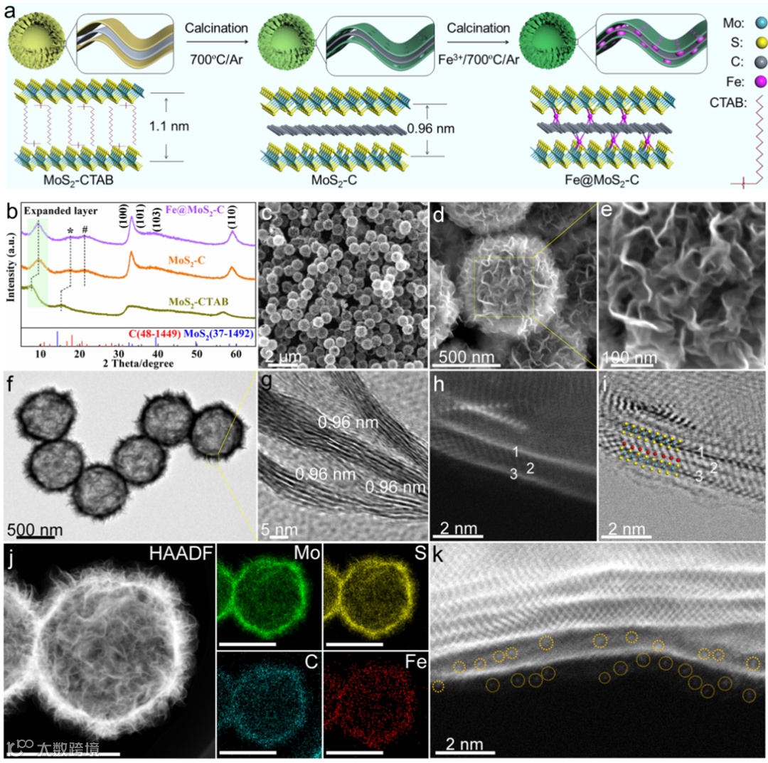 以筛选出的中空结构宿主材料为基础,借助浸渍和热处理技术,成功制备出具有插层碳和硫空位共同锚定的Fe@MoS2–C亚微米反应器(图2a)。XRD图谱表明,扩展层可由前驱体热处理原位得到,Fe单原子的锚定对扩展层没有影响(图2b)。