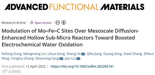 基于此,郑州轻工业大学方少明教授课题组联合中科院大连化物所刘健研究员在材料类重要期刊Advanced Functional Materials (影响因子:18.81) 上发表题为“Modulation of Mo–Fe–C Sites Over Mesoscale Diffusion-Enhanced Hollow Sub-Micro Reactors Toward Boosted Electrochemical Water Oxidation”的研究工作。