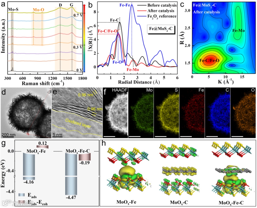 图5. 原位拉曼、循环后结构表征及理论计算:(a)施加不同电压的原位拉曼图谱。(b-c)催化前后X射线扩展边吸收谱对比及相应的小波变化。循环后催化剂的(d)透射电镜和(e)高分辨透射电镜图像。(f)电解后的高角度环形暗场像及相应的能谱面分析图像。(g)不同Fe单原子模型稳定性对比。(h)表面查分密度对比图