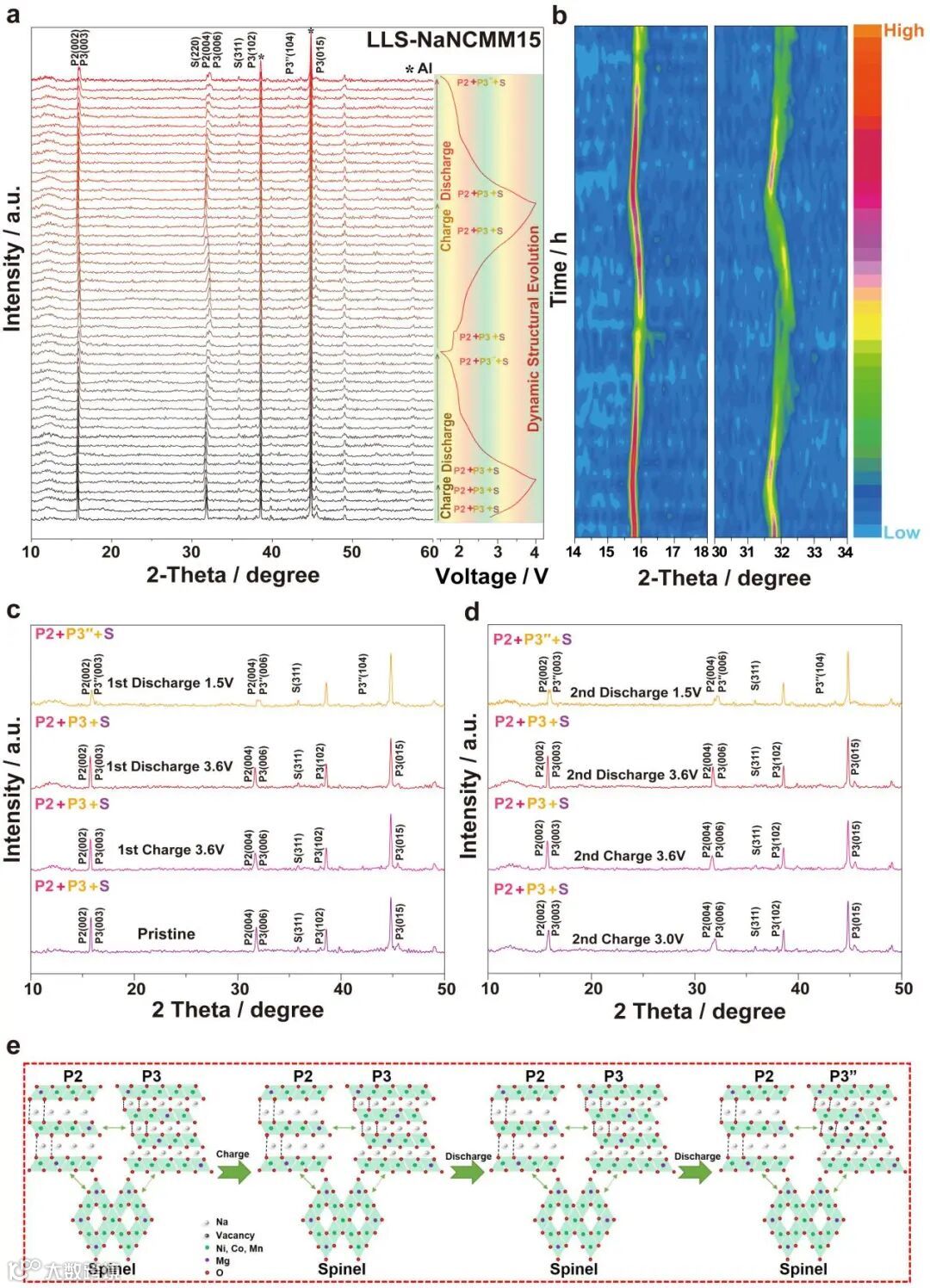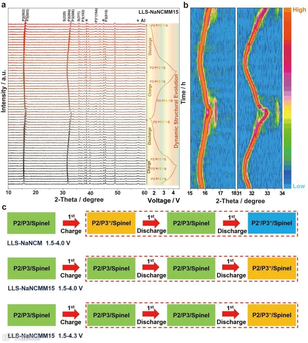 采用原位XRD对LLS-NaNCMM15正极在1.5 ~ 4.3 V的电压窗口下钠离子脱出与嵌入过程中的晶体结构演变过程进行深入的分析。从图6a可以观察到P2/P3/Spinel → P2/P3"/Spinel的简单相转变。