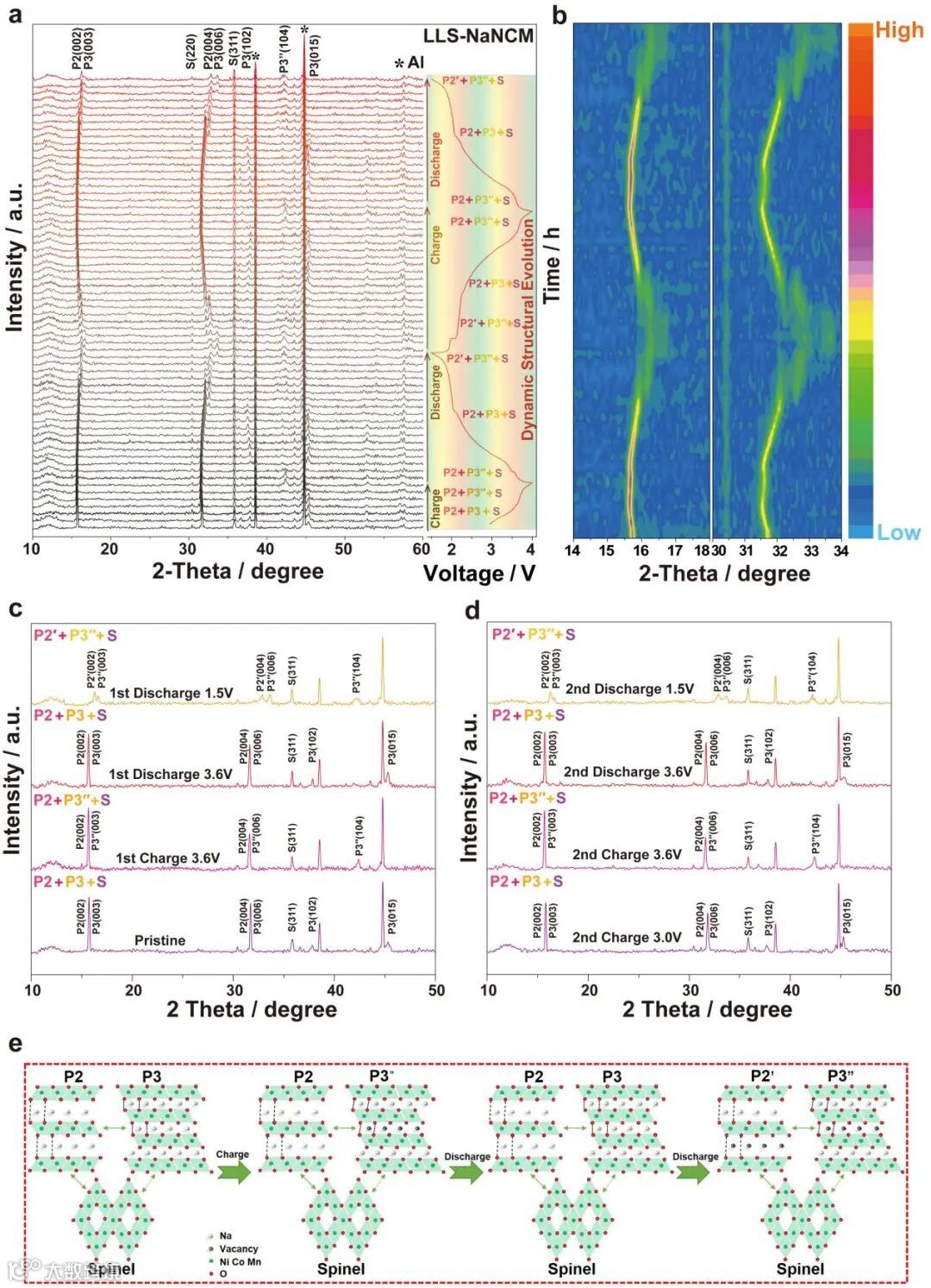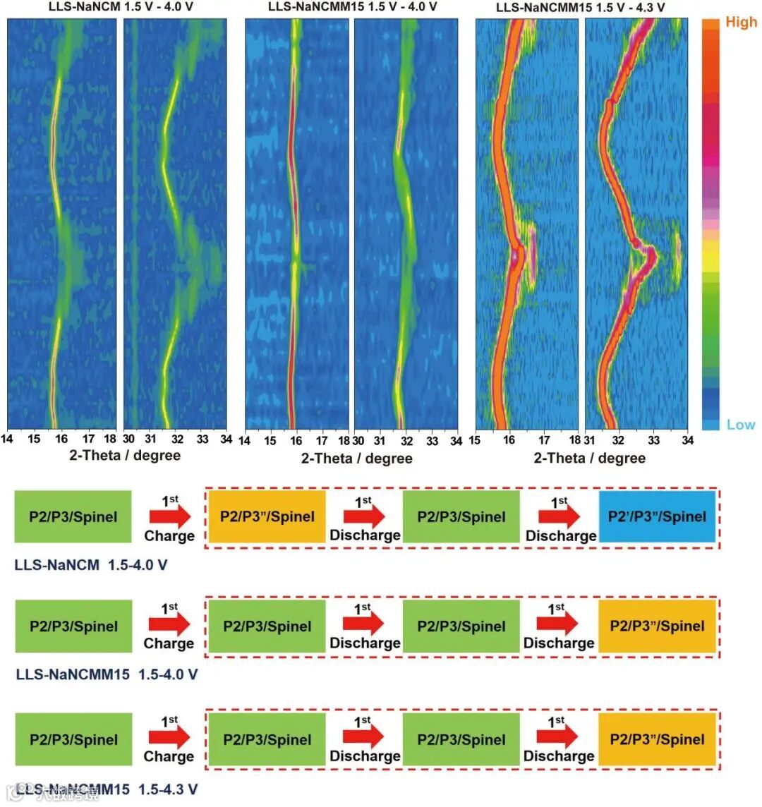 通过原位XRD探讨了LLS-NaNCM正极在0.1C时,1.5 ~ 4.0 V电压范围内前两圈充放电过程中的晶体结构演变过程。如图2所示,LLS-NaNCM正极表现出复杂的相变过程(P2/P3/Spinel→P2/P3″/Spinel→P2/P3/Spinel→P2'/P3″/Spinel),该过程伴随着严重的晶格应变,导致差的电化学性能。