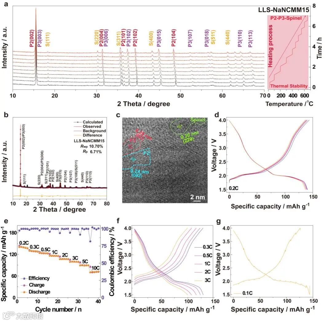 对LLS-NaNCMM15电极的热稳定性、结构和电化学性能进行了表征。采用原位变温XRD表征了该正极材料的热稳定性,发现该正极材料在整个升温过程中仍然表现出三相复合结构,表现出优异的热稳定性(图4a)。并通过XRD精修初步确定了材料的结构组成以及P2,P3和Spinel结构在正极材料晶体结构中所占的比例(图4b)。图4c中的HRTEM图进一步证实了该正极材料的三相复合结构。