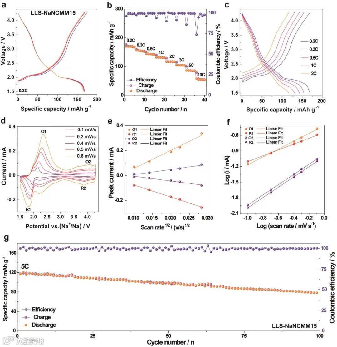 同时,利用循环伏安法(CV)对该正极的动力学性质进行了表征。如图5d所示,CV曲线上的多个氧化还原峰与充放电曲线一一对应。由公式i = avb和相应的电化学动力学定量计算可知,O1,R1,O2和R2的b值分别为0.75、0.56、0.98和0.99(图5e, f)。另外,该电极在5C下循环100圈后还可发挥出119.2 mAh g-1的比容量,说明该材料具有良好的循环性能。综上所述,在1.5 ~ 4.3 V的电压窗口内,LLS-NaNCMM15电极的电化学性能也保持良好。