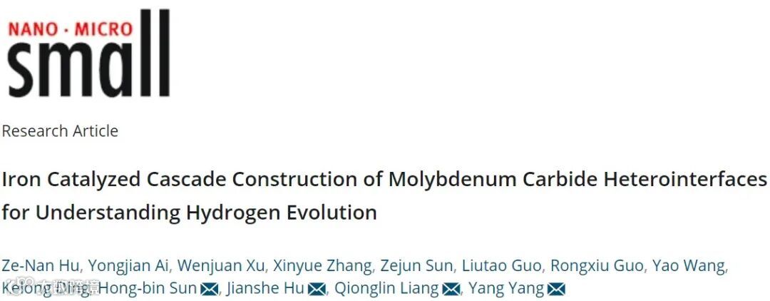 孙宏滨教授,胡建设教授,梁琼麟教授,杨阳教授,Small观点:铁能够催化级联构建碳化钼异质界面并理解在界面上的析氢反应