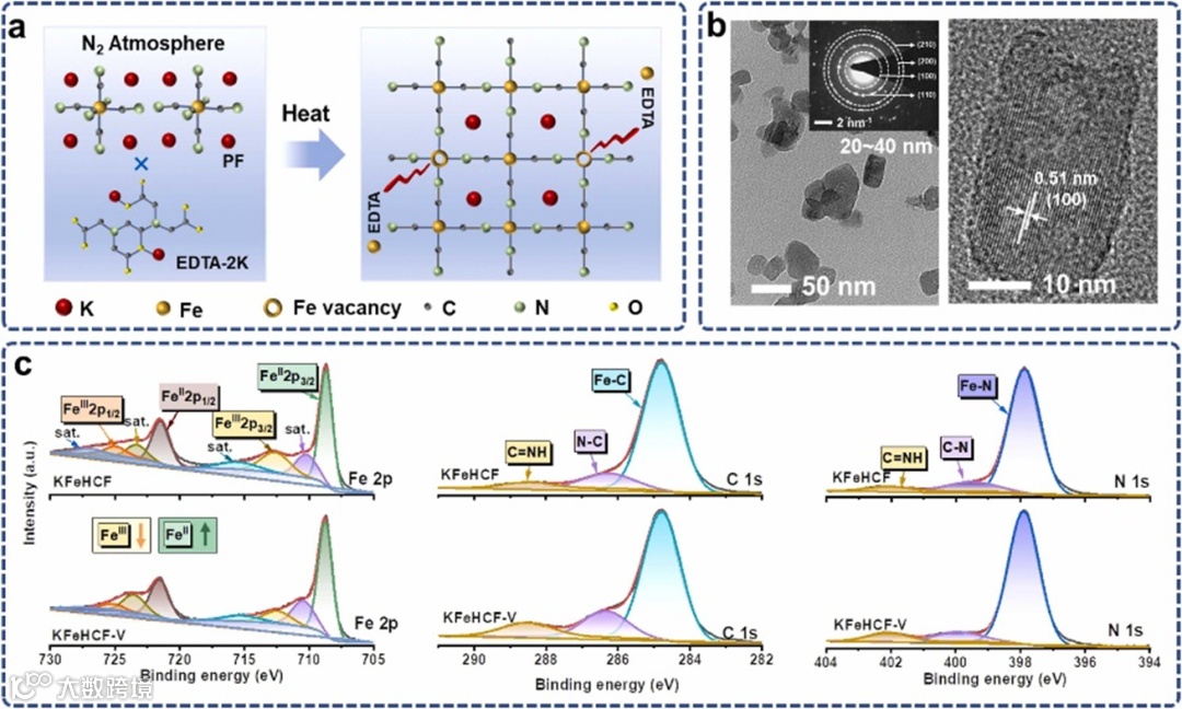 作者在制备PBA的过程中通过对其前驱中引入EDTA-2K,发现可利用EDTA-2K中的络合作用抑制普鲁士蓝FeIII(KFeHCF-V)的形成,进而导致PBAs 晶胞中FeIII位置的缺乏,从而产生了丰富的 FeIII空位。所制备的KFeHCF-V正极其表现为纳米颗粒结构,粒径范围为 20 至 40 nm 的颗粒形状。从高分辨率 TEM 图像显示 KFeHCF-V 的晶格条纹清晰,表明晶体结构良好。可以观察到0.51 nm 的晶格条纹。