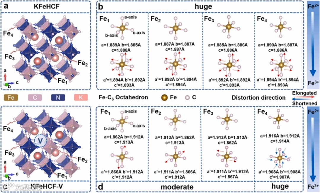 作者认为PBA 电化学性能的提升使是由于引入了 Fe III空位。为了证实这个假设,作者对其进行 DFT 计算以获得 钾离子提取过程中 KFeHCF 和 KFeHCF-V 的结构变化。与KFeHCF的结果不同的是,KFeHCF-V中只有两个方向的Fe-C键略有延长,四个方向的Fe-C键几乎没有变化。