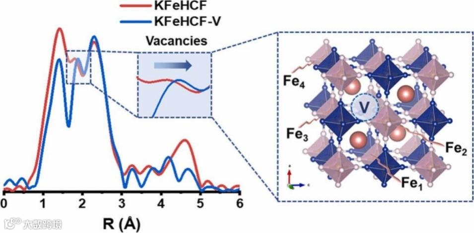 根据ICP-MS 的结果,发现KFeHCF-V的K:Fe比值(87 at.%, K1.74 FeFe(CN) 6) 高于 KFeHCF (49 at.%, K0.98 FeFe(CN)6 ),表明 KFeHCF-V 处于富钾状态。根据拉曼光谱发现KFeHCF-V中Fe II和Fe III配位的含量与KFeHCF接近,结合其XPS与XAFS的分析发现,PBA 中引入 DETA-2K, Fe III的含量减少,而 Fe II的含量增加。鉴于不变的 Fe II和拉曼光谱中的 Fe III配位位置,作者认为 Fe III空位出现在 KFeHCF-V 中。