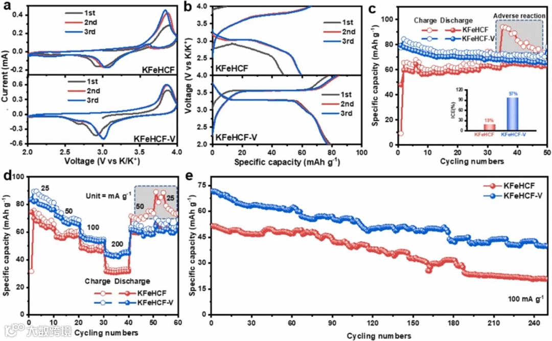此外, KFeHCF 仅表现出非常差的 19% 的初始库仑效率 (ICE),这应归因于在没有空位的情况下难以提取 PBA 的 K 离子。与 KFeHCF 相比,由于引入 FeIII空位增加了钾离子扩散,KFeHCF-V 的 ICE 提高到 97%。在循环50 次后,KFeHCF在 25 mA g-1下的初始放电比容量仅为 63 mAh g -1,并在循环至 32 次后可观察到明显的不良反应,这是因为多次循环中晶格变形的累积,导致大量钾离子无效返回。