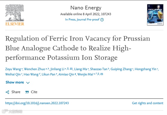 在这里,来自暨南大学的黎晋良副研究员与麦文杰教授,在国际知名期刊Nano Energy上发表题为“Regulation of Ferric Iron Vacancy for Prussian Blue Analogue Cathode to Realize High-performance Potassium Ion Storage”的报告文章。