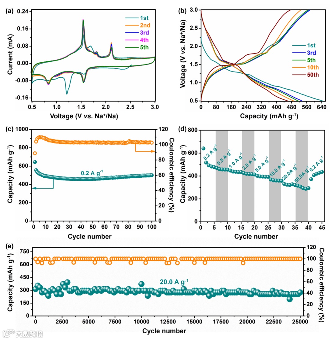 如图2所示,作为SIB负极材料,Cu3VS4可以实现274 mAh g-1(20 A g-1下25000次循环)的循环稳定性和优异的速率性能(50 A g-1时为307 mAh g-1)。