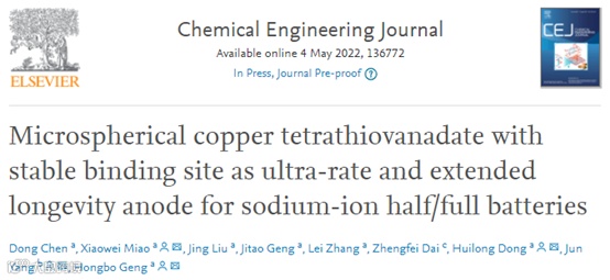 基于此,来自常熟理工学院的更红波教授与江苏科技大学的杨骏博士合作,在国际知名期刊Chemical Engineering Journal上发表题为“Microspherical copper tetrathiovanadate with stable binding site as ultra-rate and extended longevity anode for sodium-ion half/full batteries”的研究论文。该观点文章探讨了Cu3VS4的简易制备及其作为钠离子电池负极材料的性能、储钠机理及其全电池应用。
