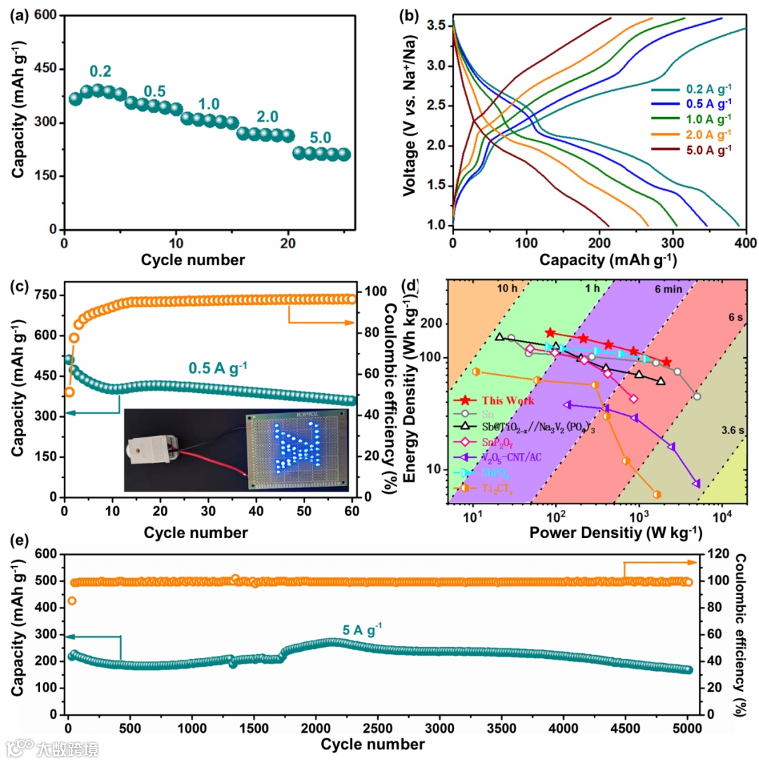 在钠离子全电池测试中,使用Na3V2(PO4)2O2F正极与Cu3VS4装配,全电池的循环稳定性性能在0.5 A g-1下进行(图5c和S14)。全电池能量密度高达171 Wh kg-1,并在5 A g-1电流密度下经过5000次循环后,仍具有181 mAh g-1的循环稳定性,(图4)。